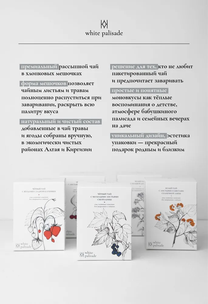 В чайные композиции White Palisade добавляют травы и ягоды ручной сборки из экологически чистых районов: никаких ароматизаторов, красителей и подсластителей. Только простые и натуральные составы.
