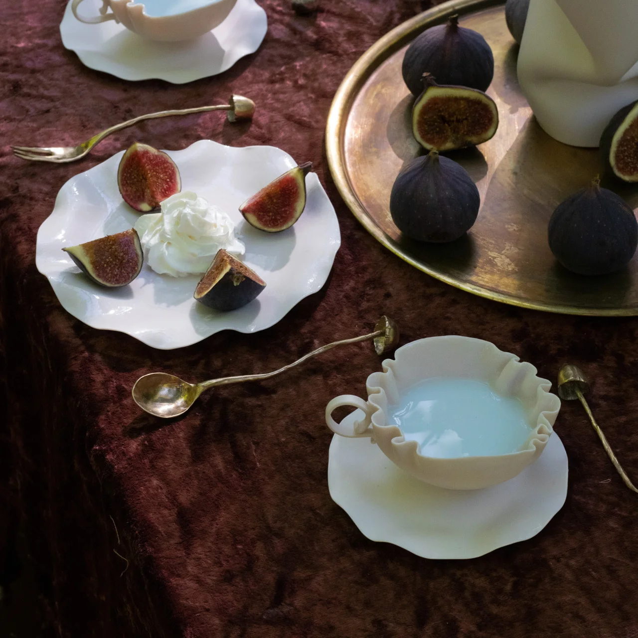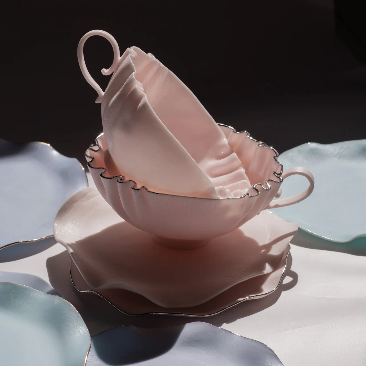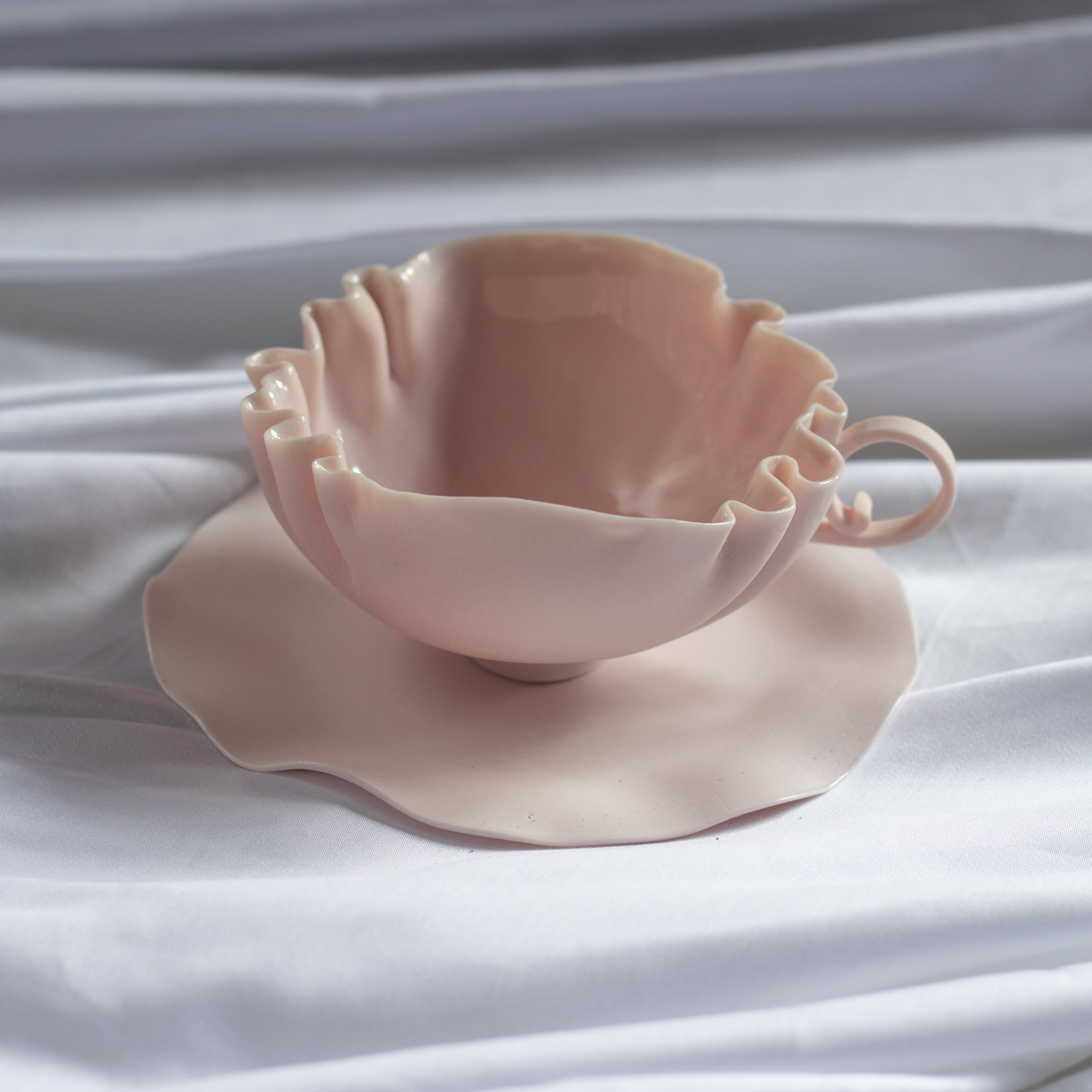 Создается полностью вручную — каждая пара имеет индивидуальный рисунок складок, изгиб ручки и форму блюдца, но общая форма остаётся одинаковой.