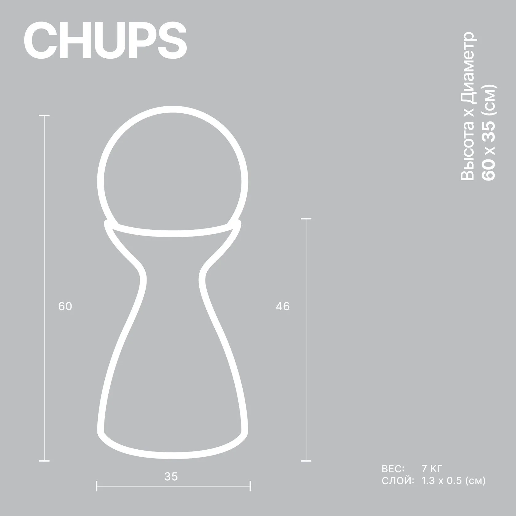 CHUPS — пуф с мягким сидением. Концептуально вдохновлён формой конфеты. Каждый пуф представлен в монохроме, цвета мягкого сидения подобраны в цвет палитры бренда. Выпущен в серии совместно с пуфом CANDY, но отлично смотрится и по отдельности.