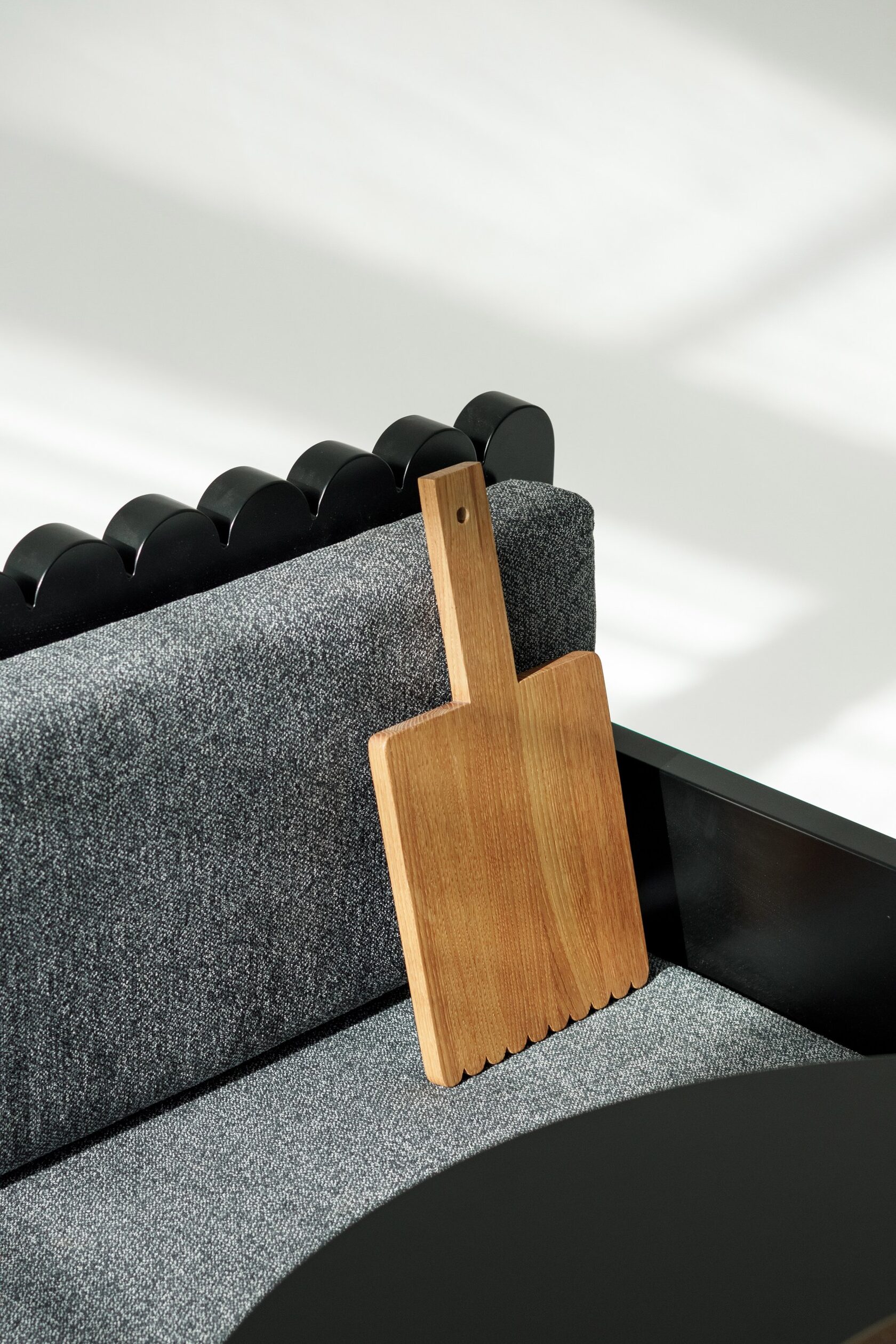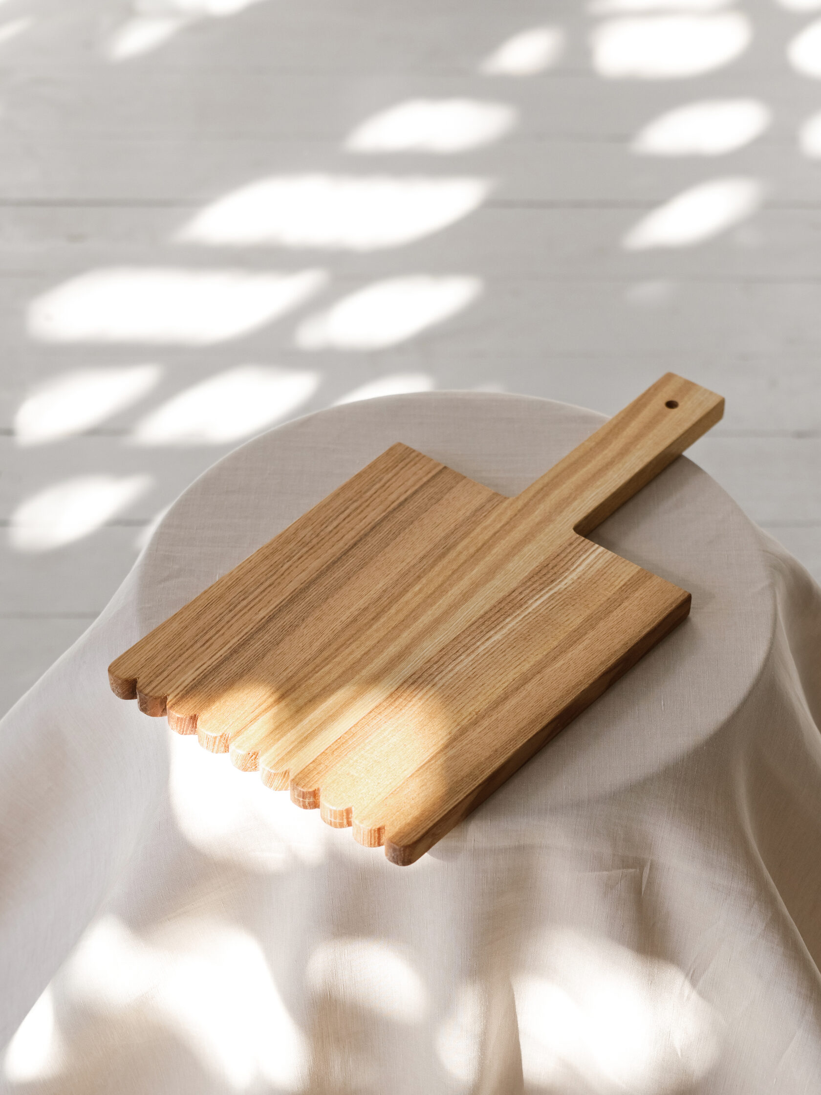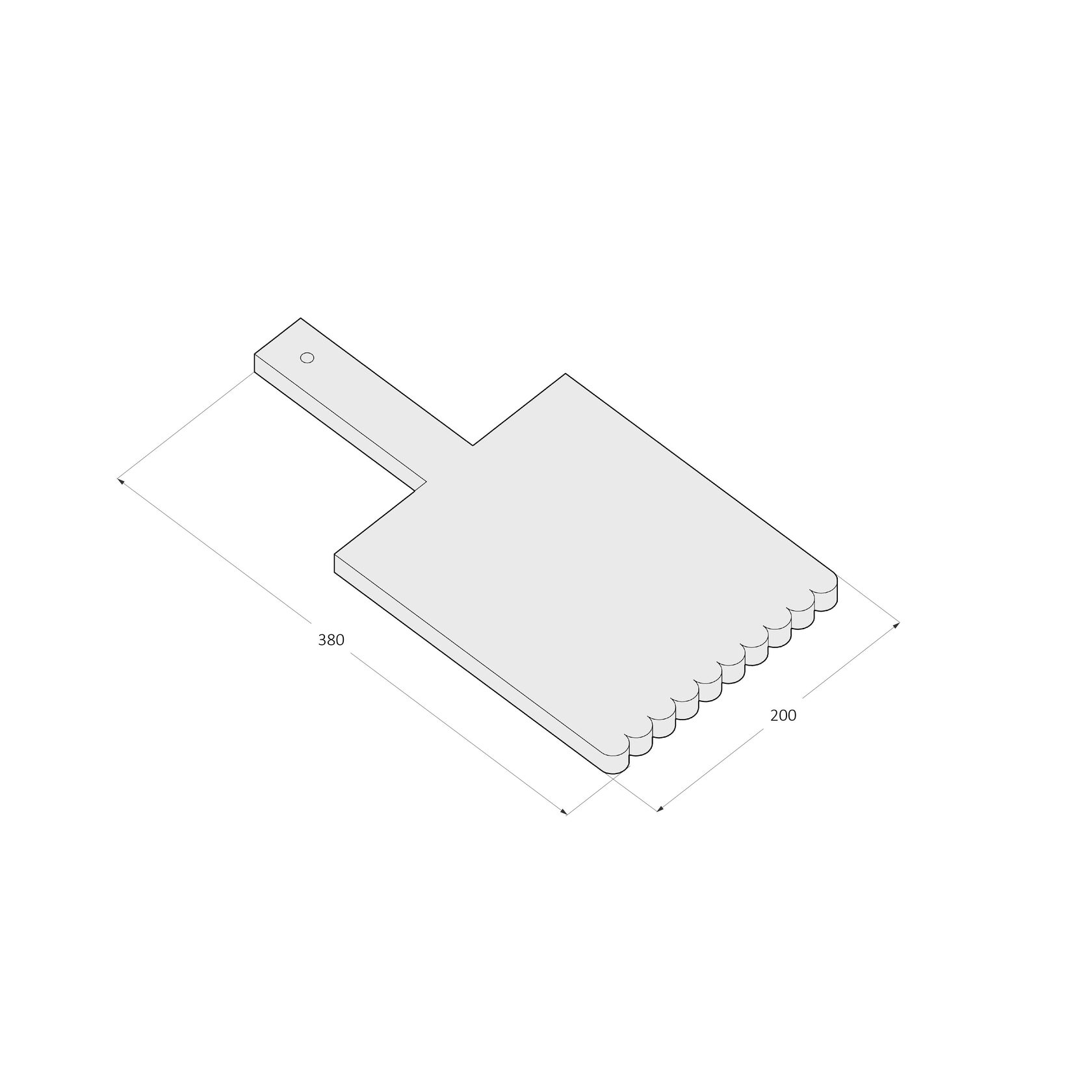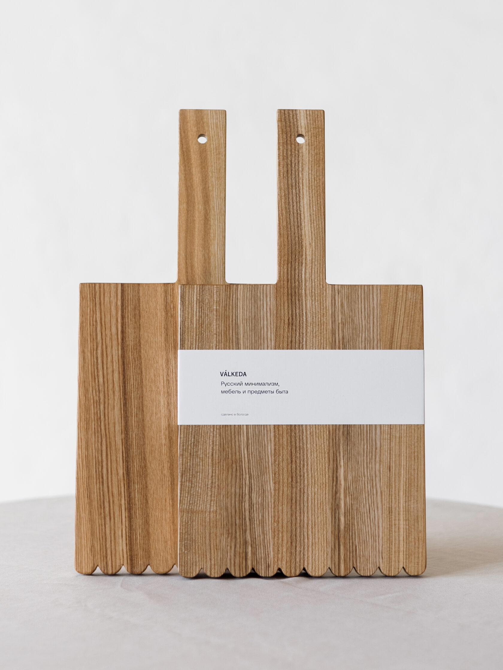 Разделочная доска имеет внизу рельефный рисунок, вдохновлённым рубелем — предметом с поперечными желобками, которым раньше пользовались в деревнях для стирки и глаженья (катания) белья. Сдержанная декоративность в сочетании с современной формой позволит использовать её в различных интерьерах.