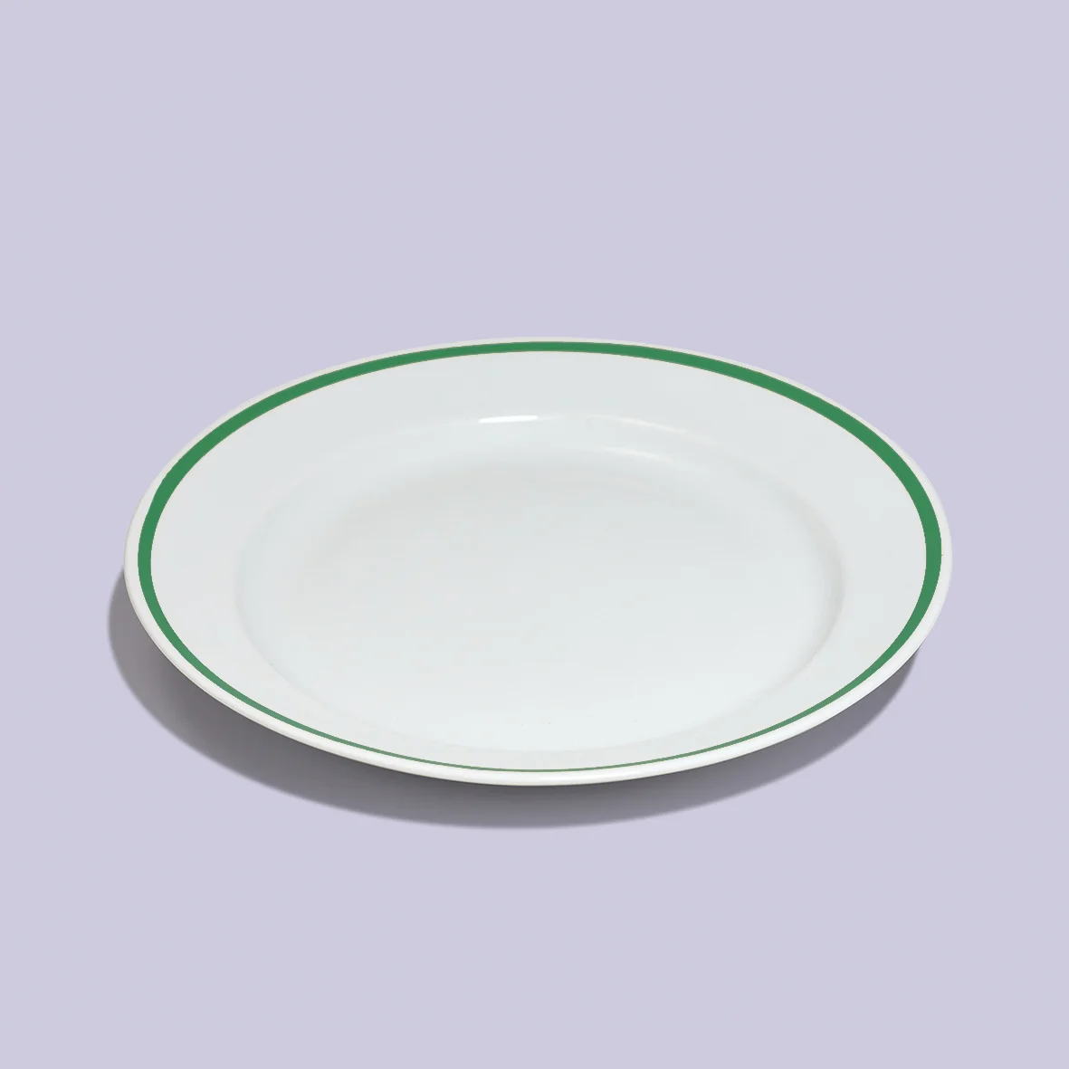 Большая плоская белая тарелка с зелёной каймой.