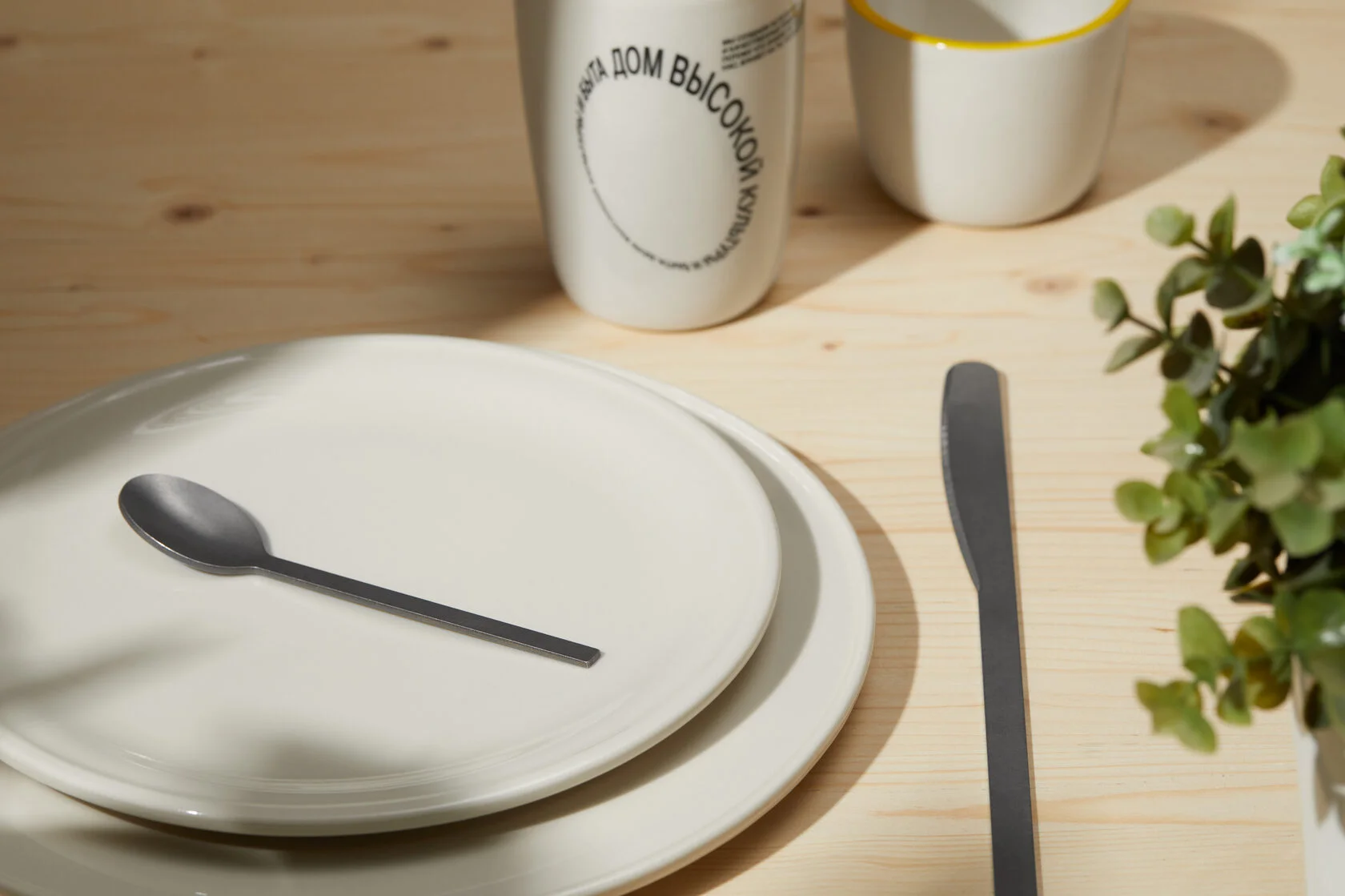 Плоская тарелка костяного цвета из полуфарфора, разработанная основателем бюро Supaform Максимом Щербаковым. Основное отличие коллекции СУПАФОРМ от других — усиленная кромка и яркая расцветка.