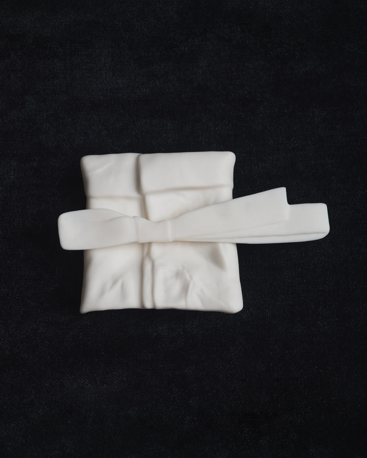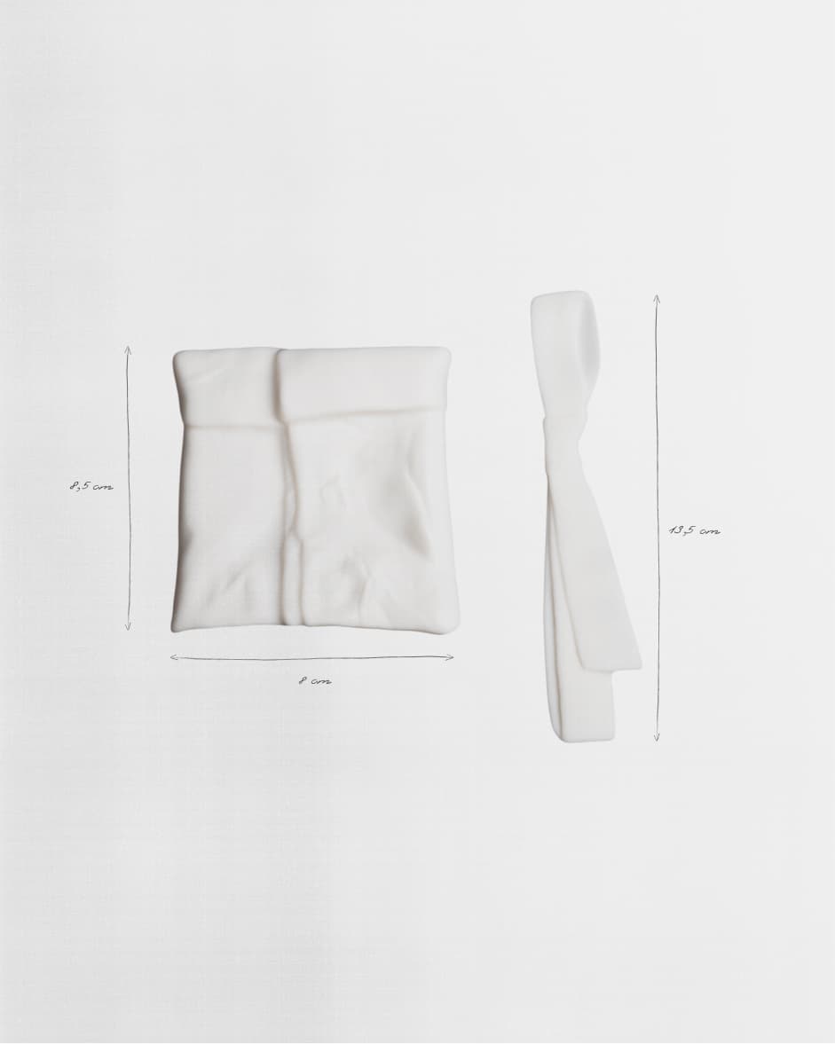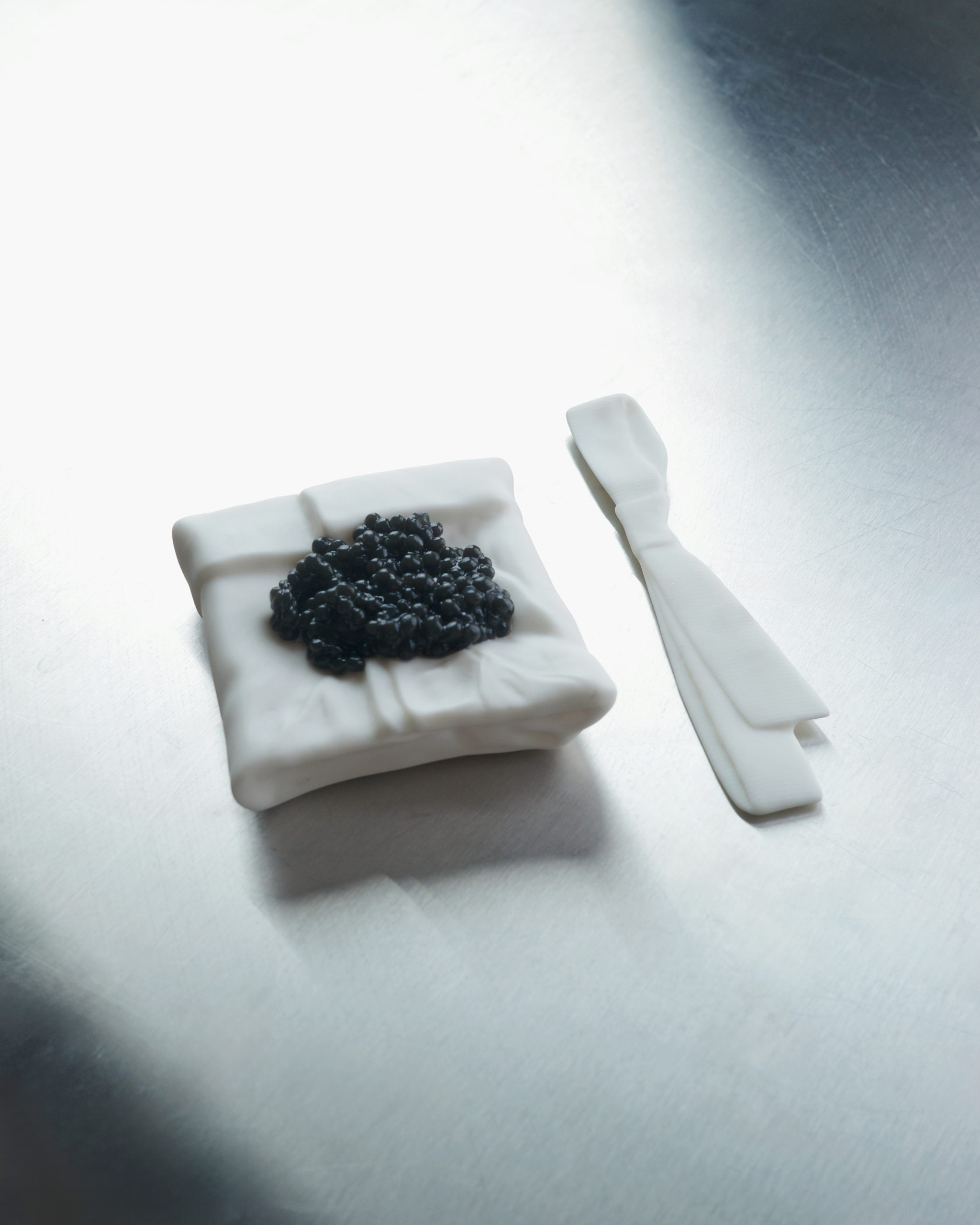 Фарфоровые лоточек и ложечка для икры. Вместе они как свёрток с бантиком.