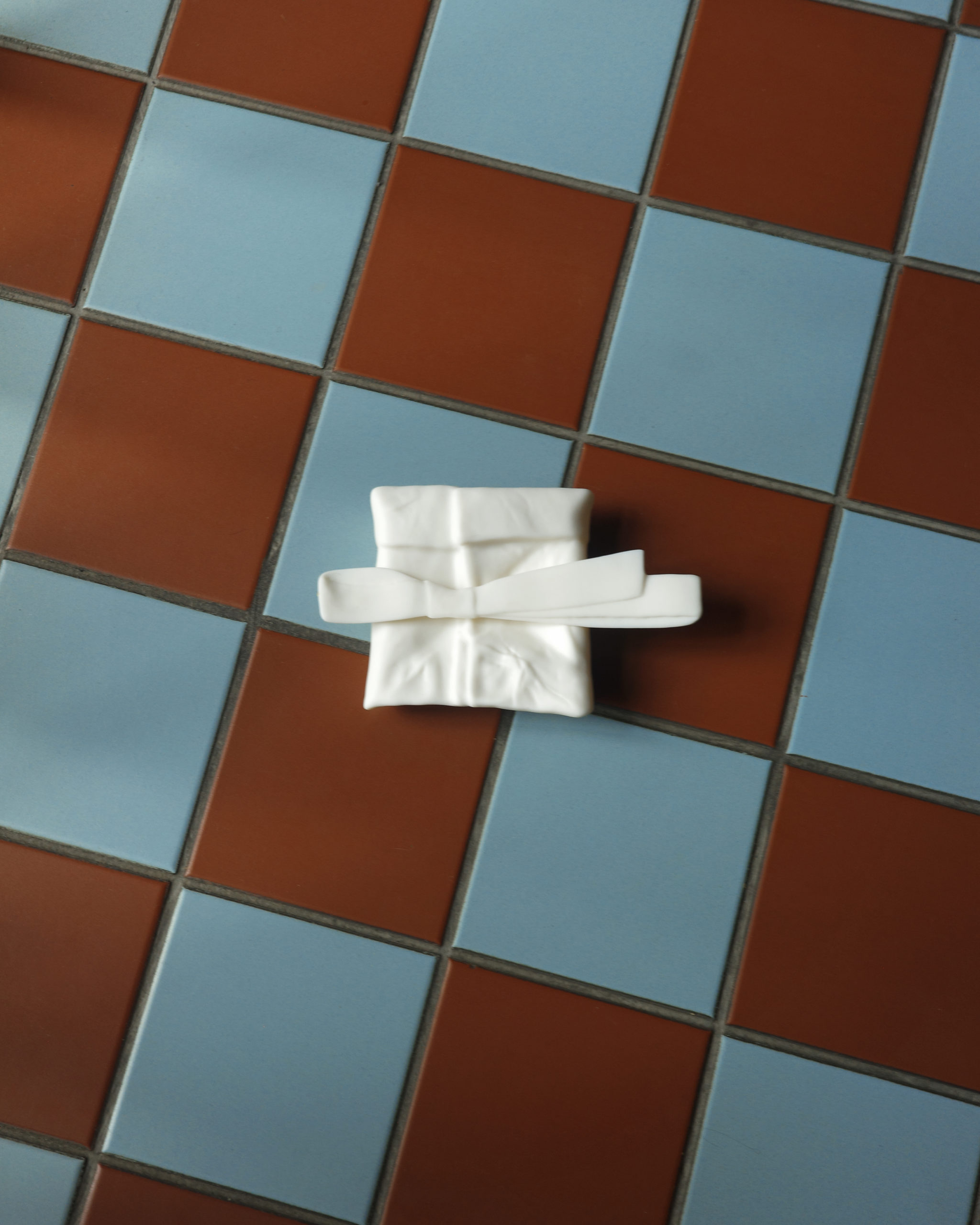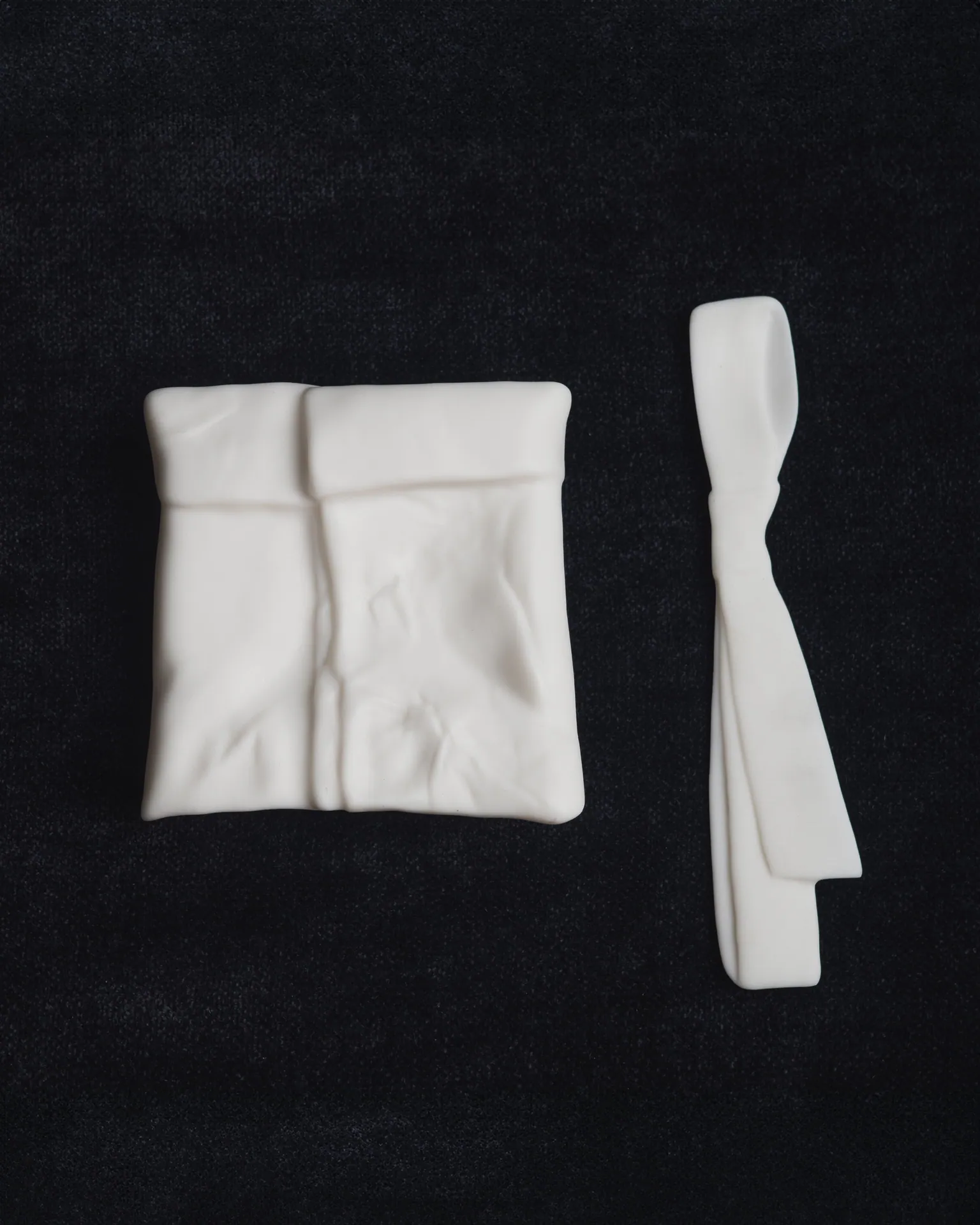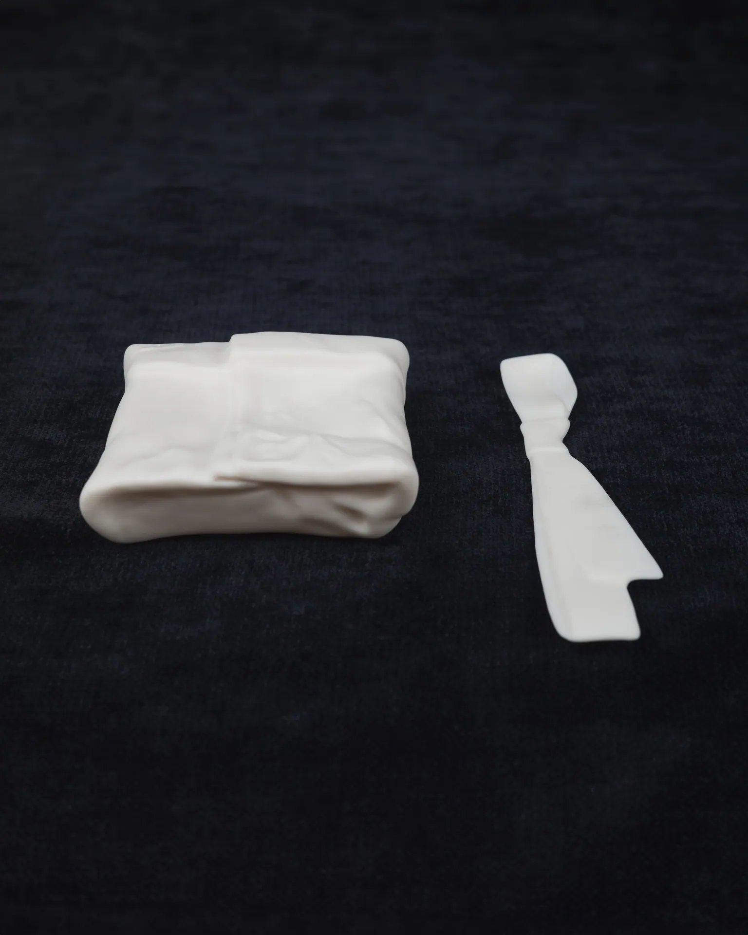 Фарфоровые лоточек и ложечка для икры. Вместе они как свёрток с бантиком.