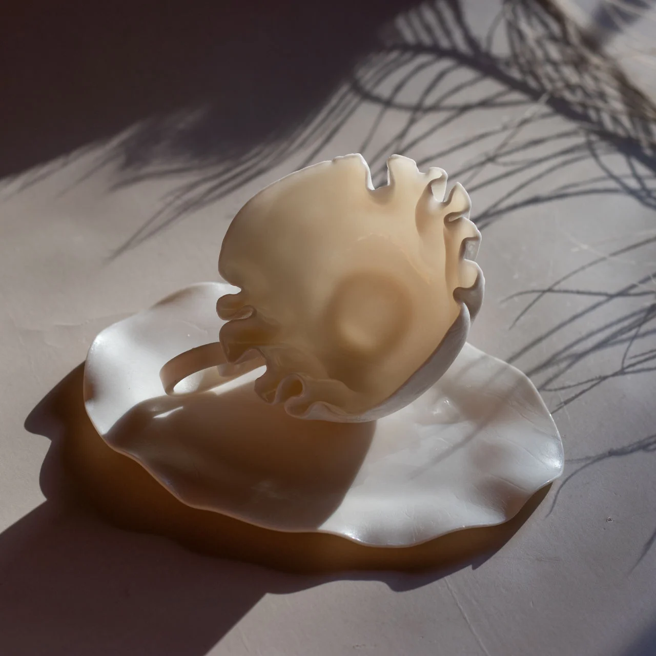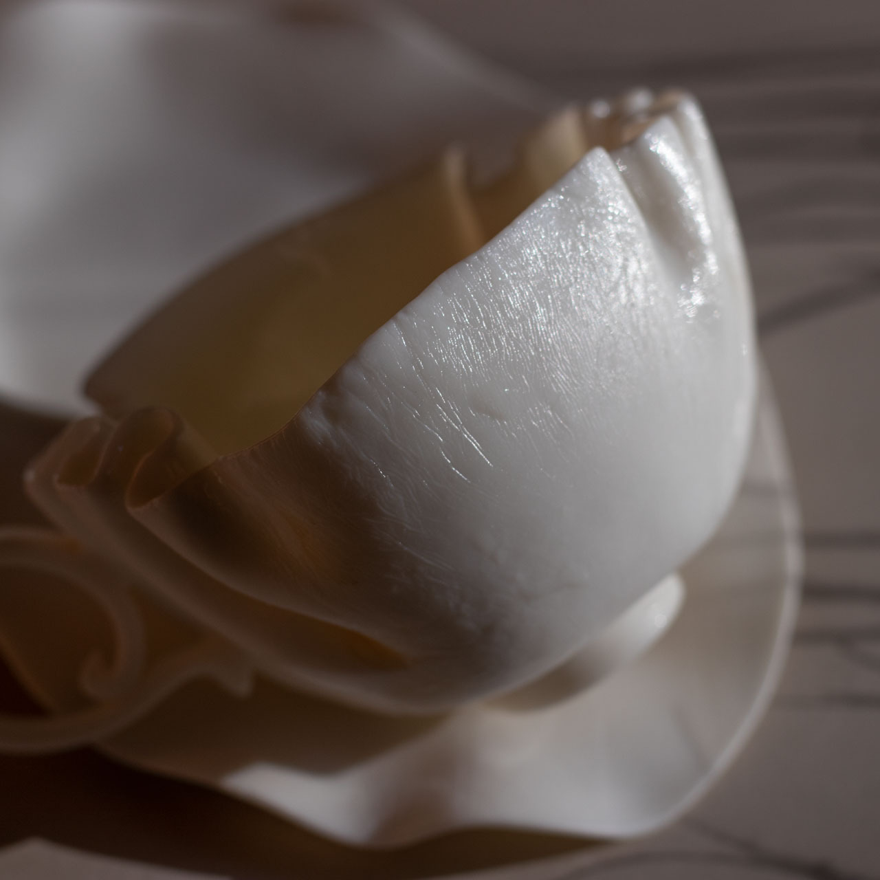 Внутренняя часть чашки покрыта глянцевой глазурью, а наружная поверхность и блюдце — матовый бисквитный фарфор с тонкой текстурой, напоминающей лепестки роз и кожу.