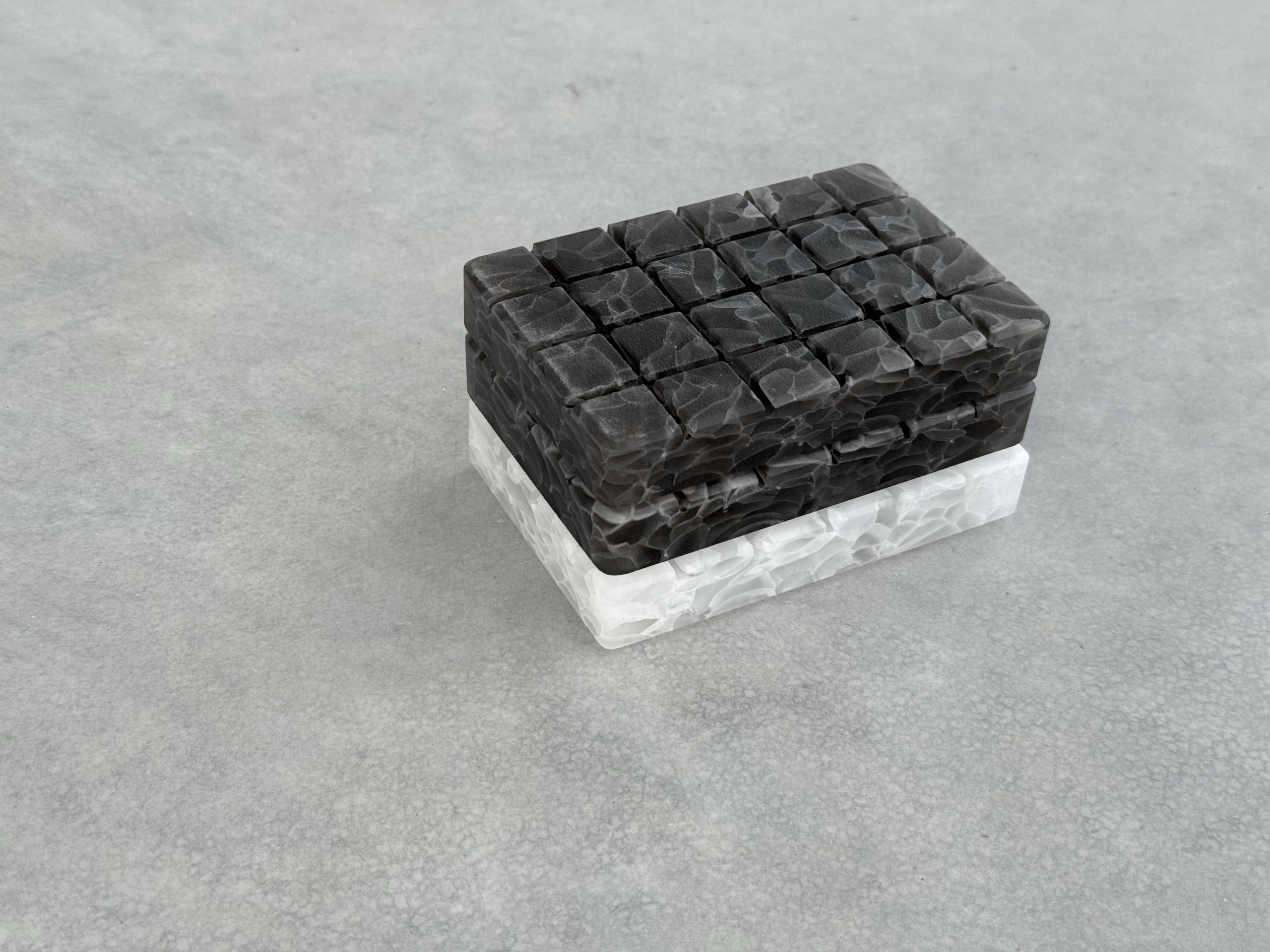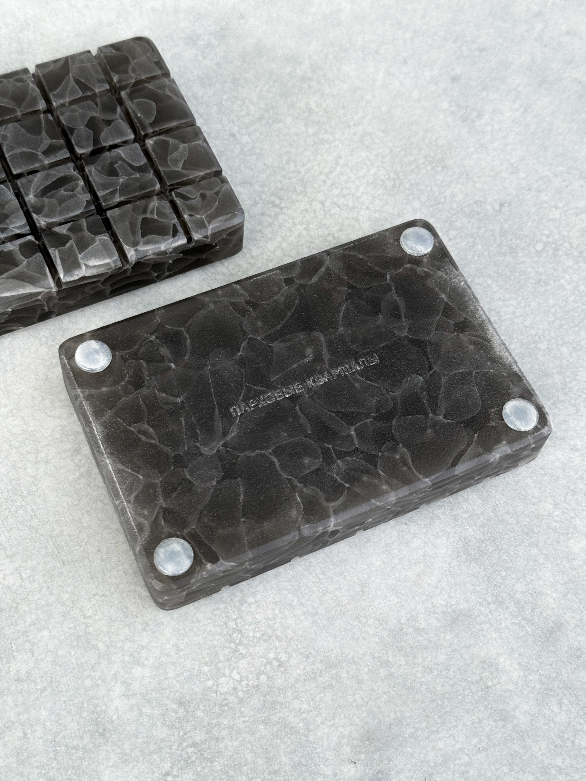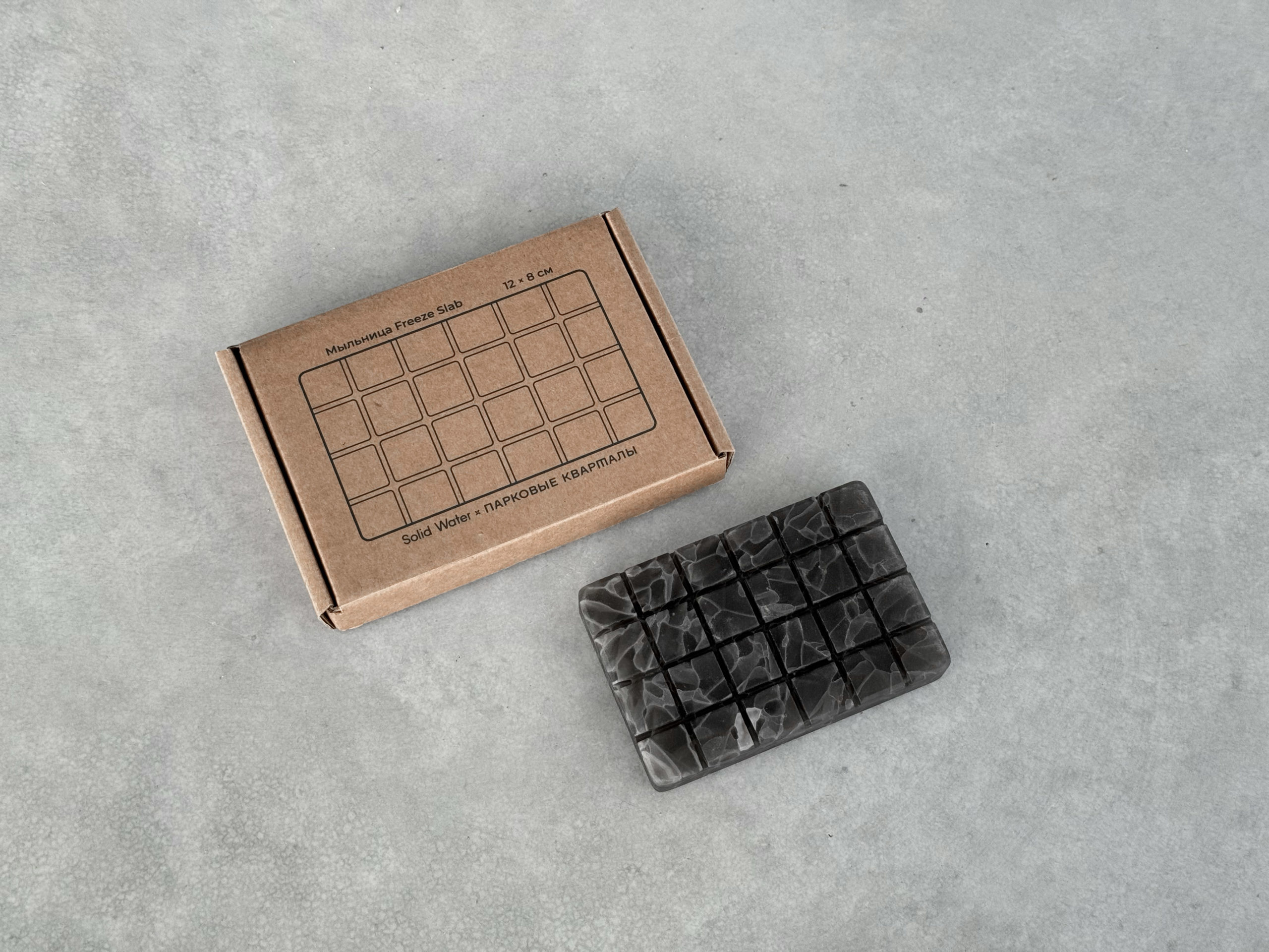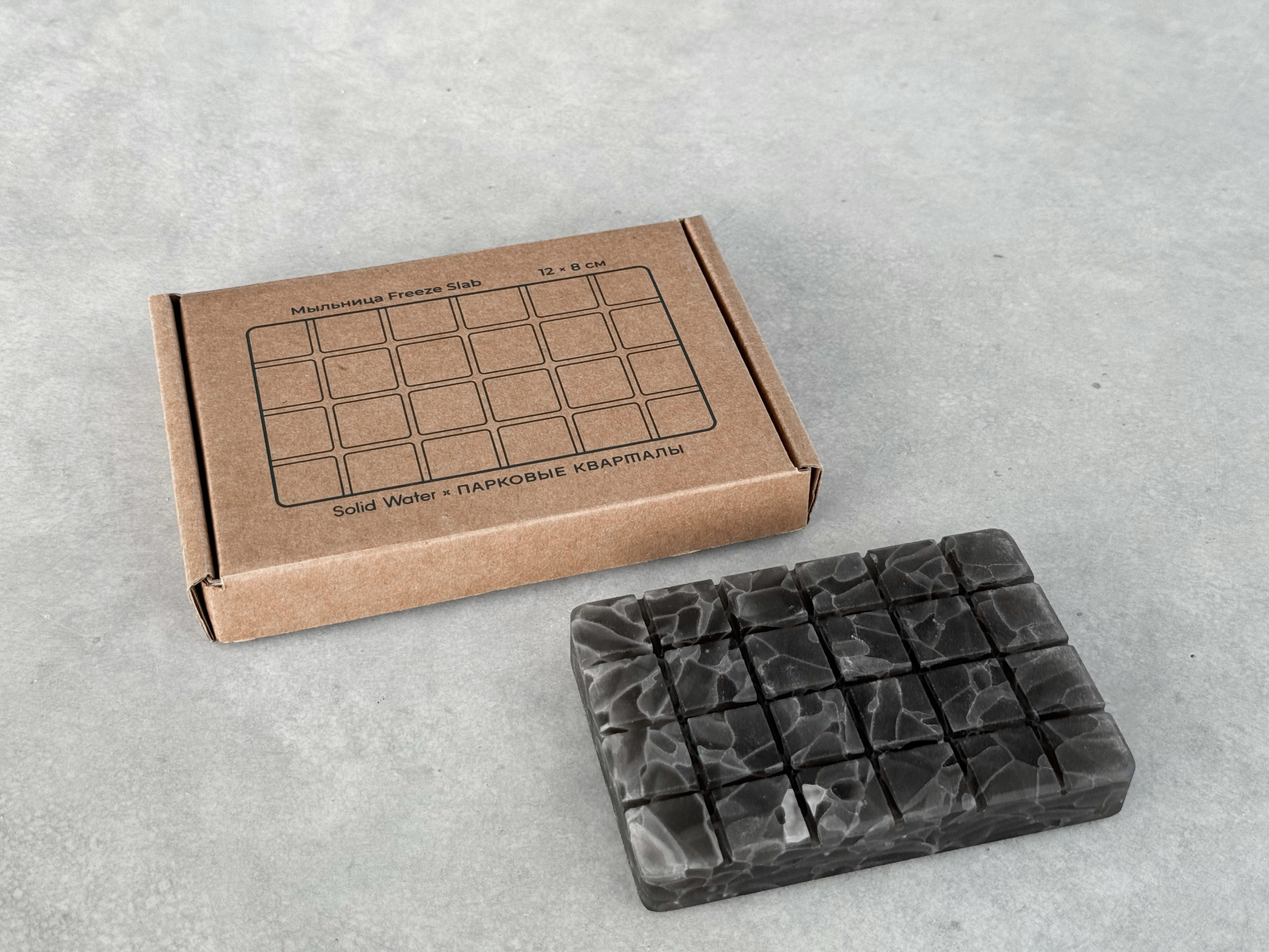 Freeze Slab — это лед, который не тает. Эффект глубины толщи льда достигается за счет использования переработанного стекла. Коллекция включает в себя сервировочные доски и аксессуары, идеально подходящие для подачи морепродуктов, десертов и дегустационных меню. Мыльница имеет рельеф, в желобки стекает лишняя вода. С обратной стороны есть небольшие силиконовые ножки, чтобы изделие не скользило.