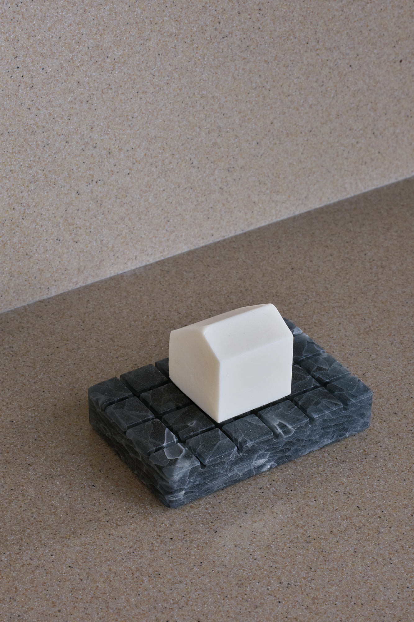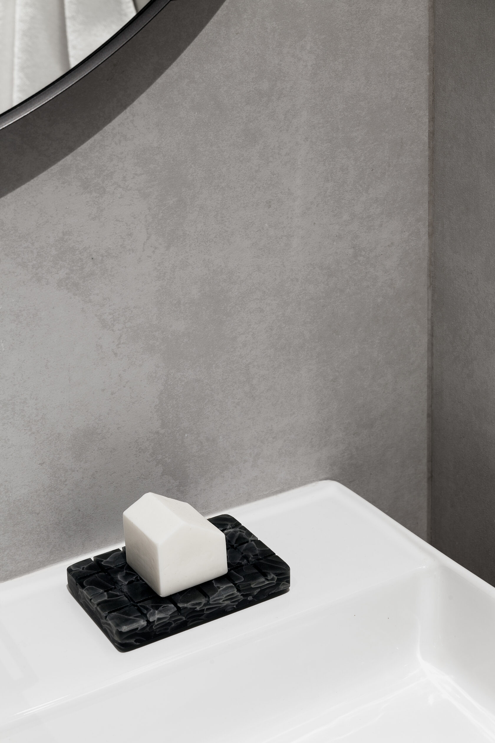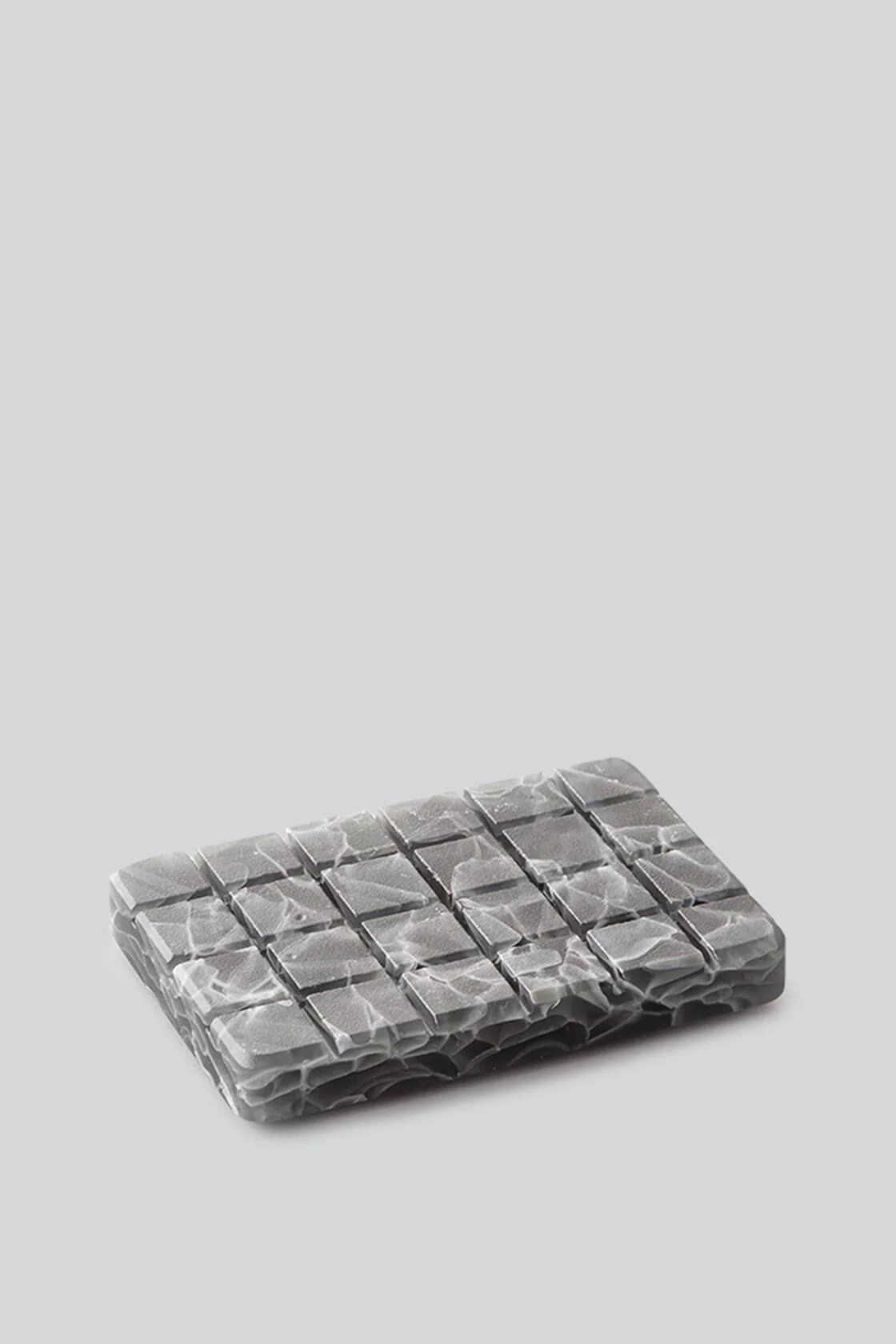 Freeze Slab — это лед, который не тает. Эффект глубины толщи льда достигается за счет использования переработанного стекла. Коллекция включает в себя сервировочные доски и аксессуары, идеально подходящие для подачи морепродуктов, десертов и дегустационных меню. Мыльница имеет рельеф, в желобки стекает лишняя вода. С обратной стороны есть небольшие силиконовые ножки, чтобы изделие не скользило.