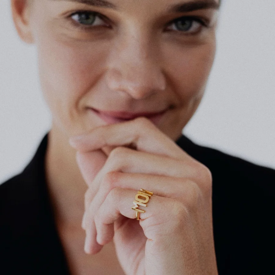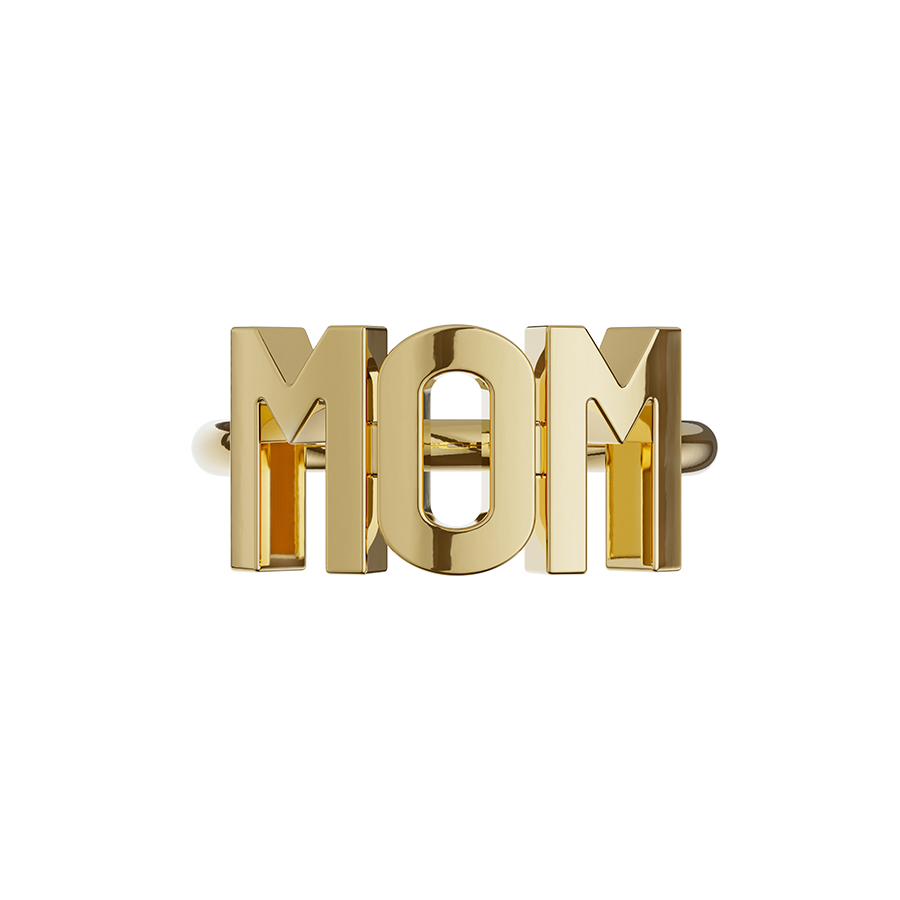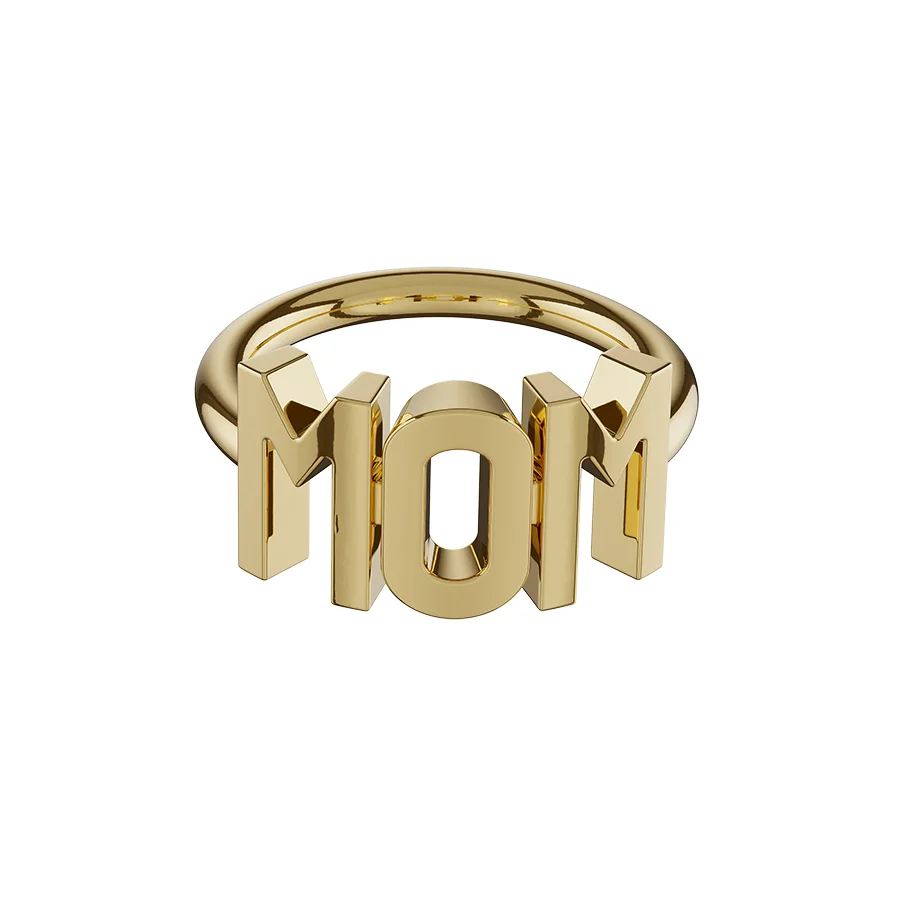 Кольцо выполнено из латуни с позолотой и читается одновременно как «MOM» и как «WOW», потому что каждая мама- это вау!