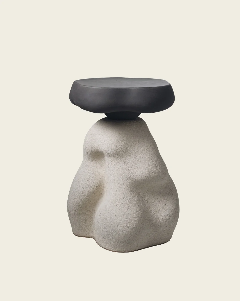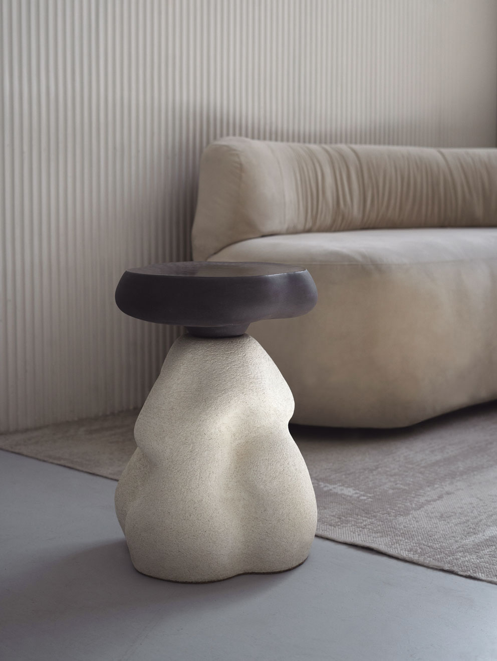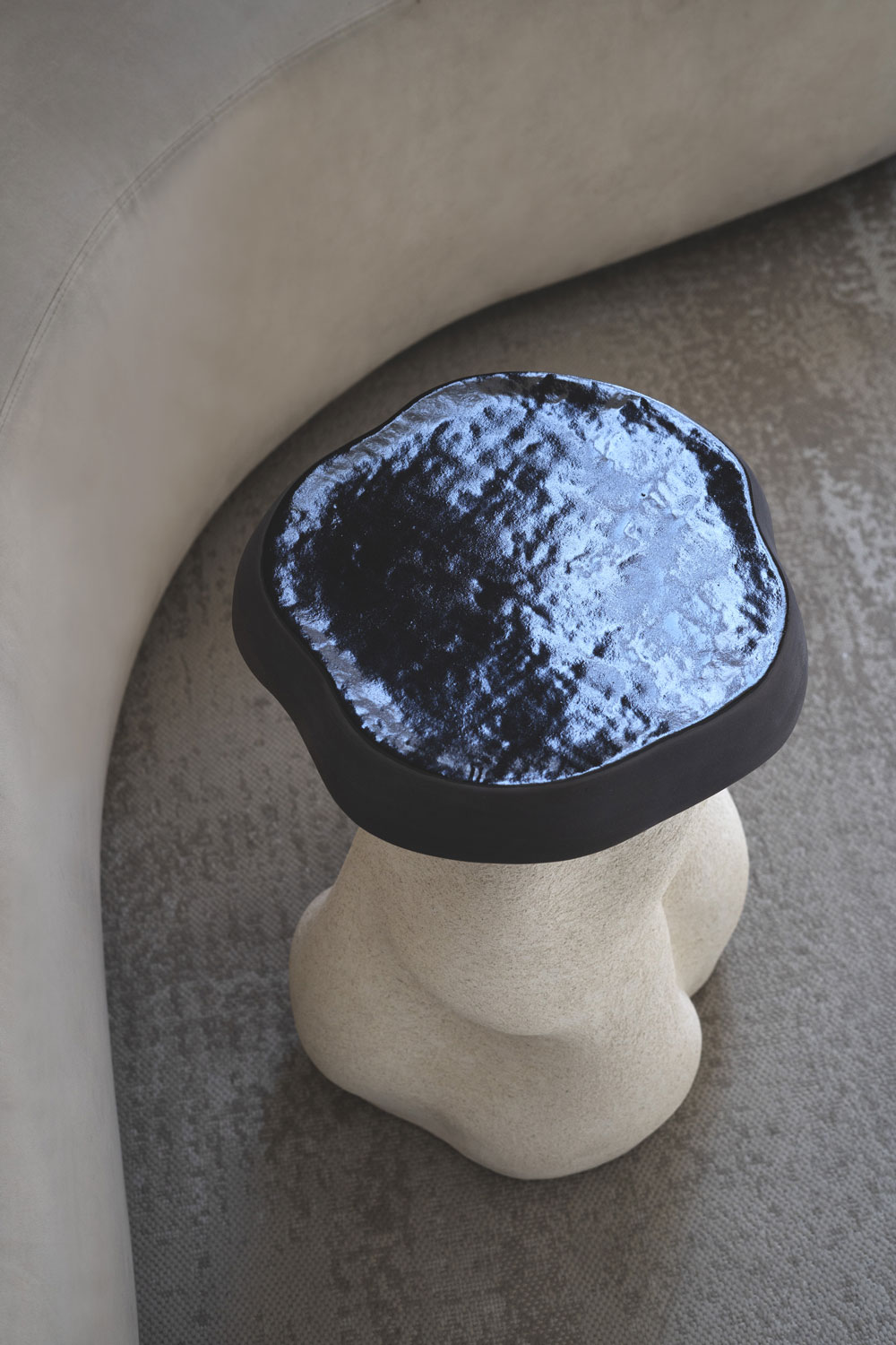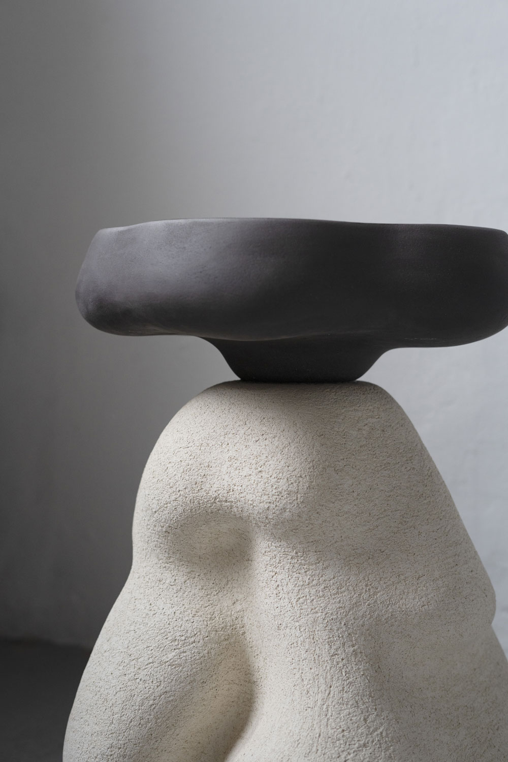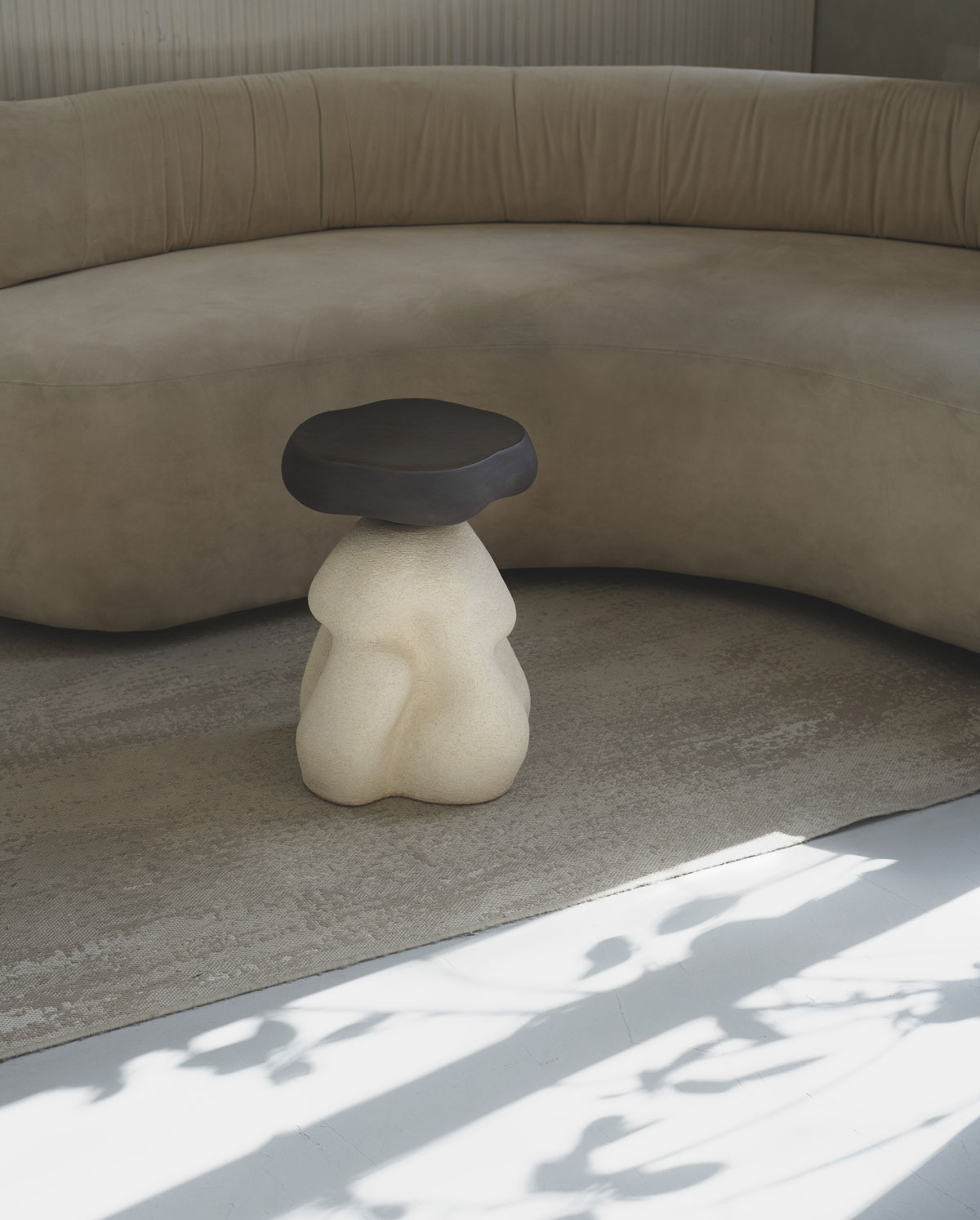 Керамический столик, слепленный вручную из глины в жгутовой технике. Процесс создания практически полностью интуитивный: на эскизе силуэт набрасывается лишь в общих чертах, а дальше в процессе лепки шаг за шагом выстраивается окончательная форма, рожденная в потоке сознания и воплощенная в материальном мире с помощью глины. Именно поэтому каждый столик получается индивидуальным и транслирует свое особенное настроение.