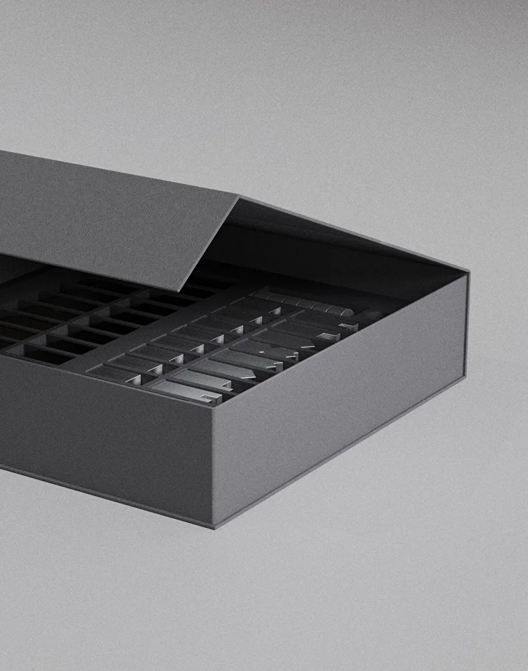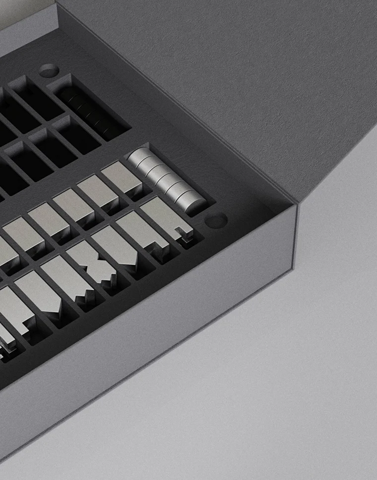 Все элементы удобно хранятся в индивидуальных кармашках из премиум материала EVA внутри коробки из кашированного картона с магнитом.