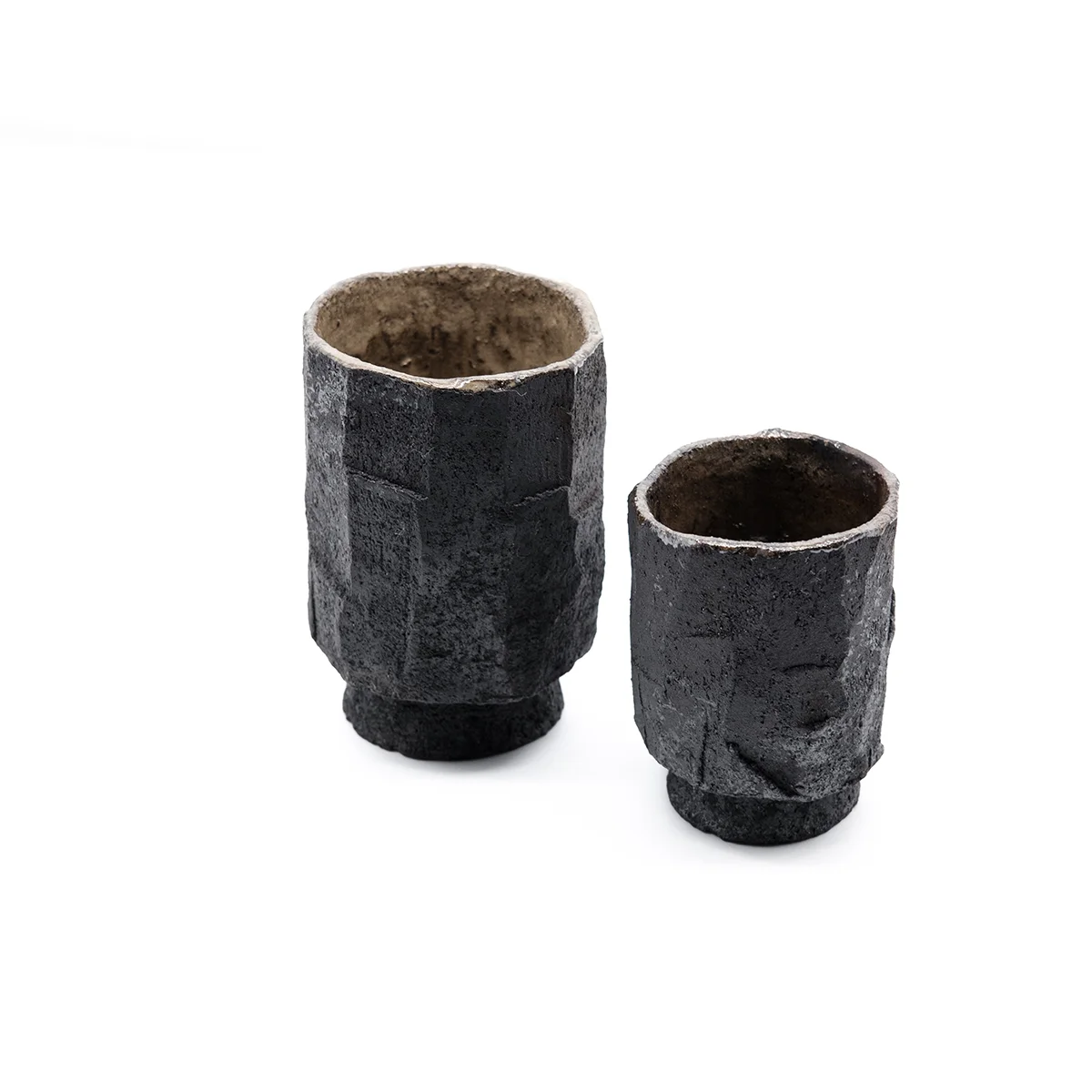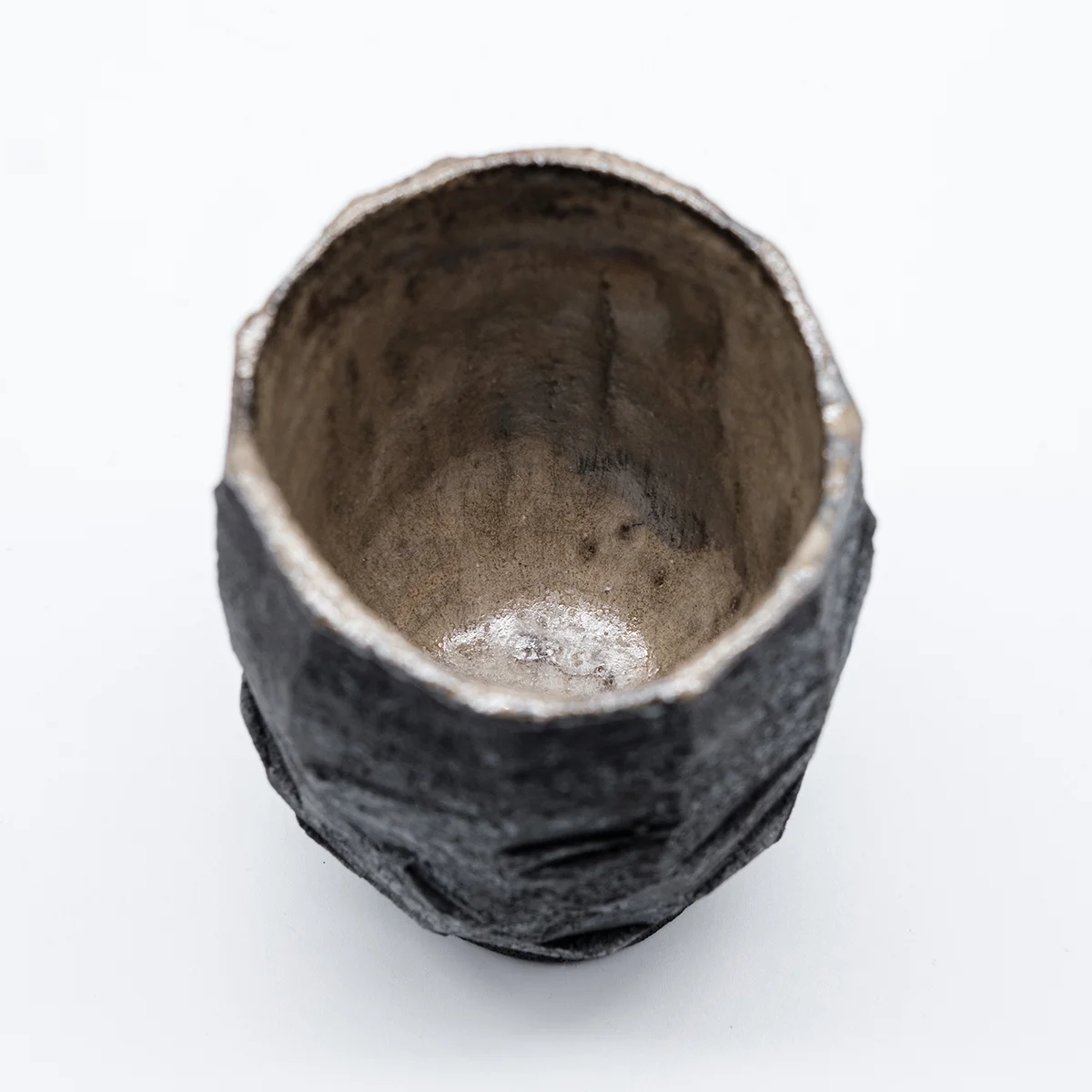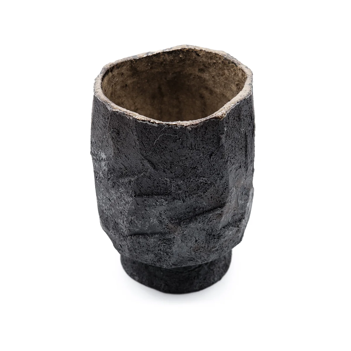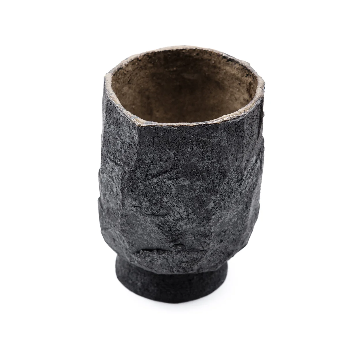 Эта чашка вырезана вручную из цельного блока глины и обожжена методом раку. Чашка покрыта глазурью внутри и может быть использована для напитков.