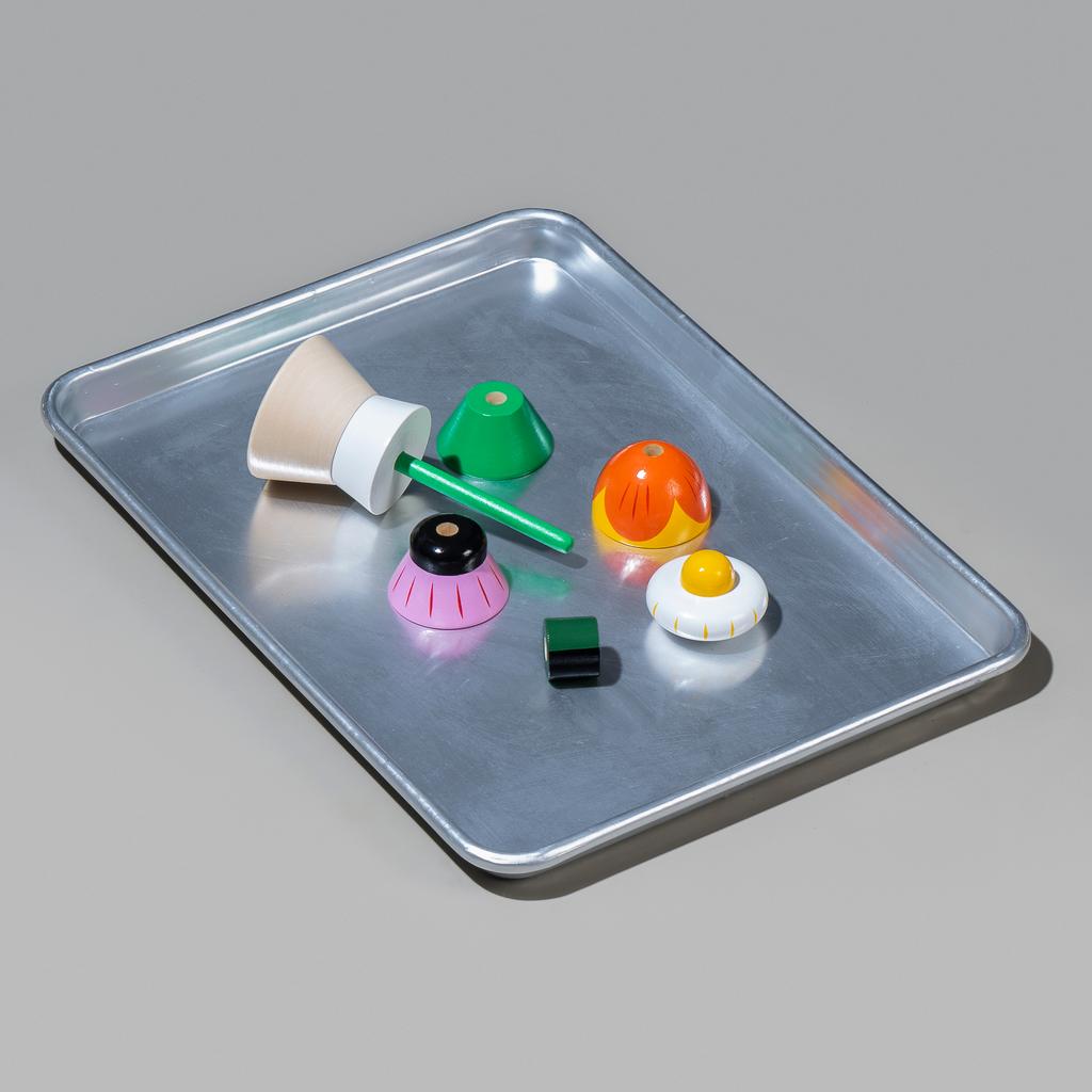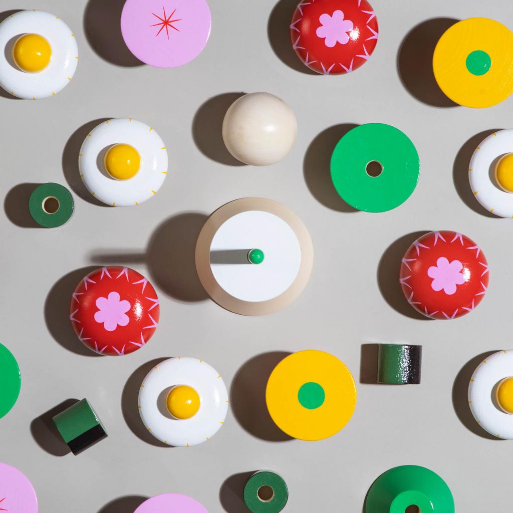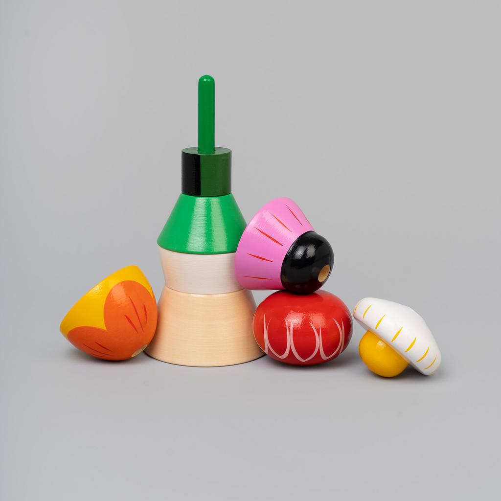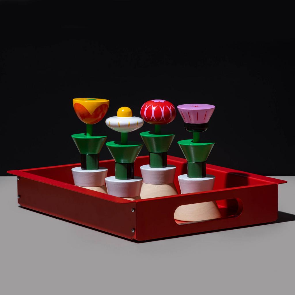 Деревянная ваза-конструктор с цветком, у которого меняется верхушка. Состоит из семи частей, где основание пирамидки – ваза, а ось – стебель цветка, на который надеваются колечки-детали. В наборе с каждой вазой – четыре бутона: цветок чертополоха, пион, тюльпан и белая эхинацея.