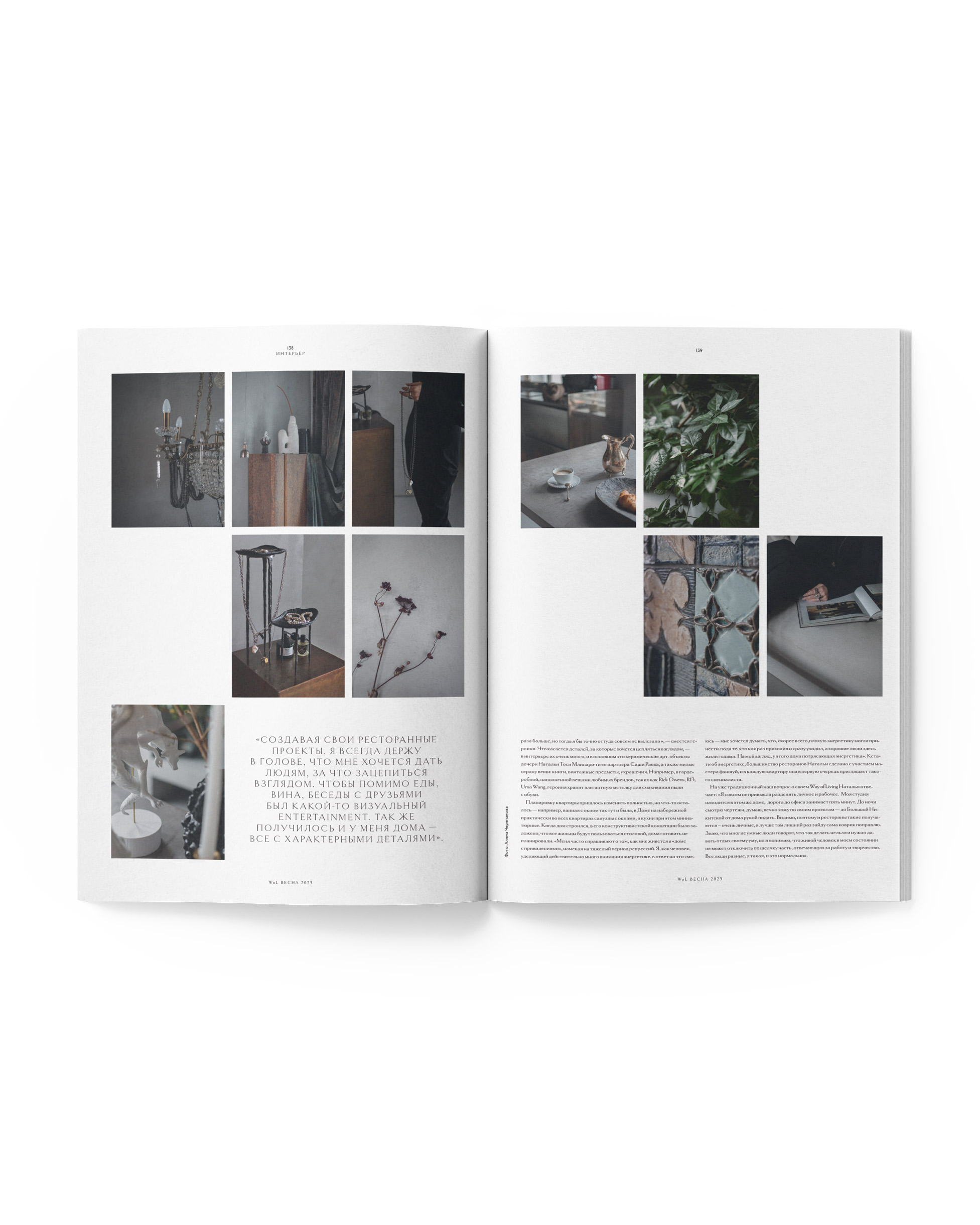 В первом номере мы собрали истории людей, которые каждый по-своему, но очень значимо, вносят вклад в развитие творческих индустрий. Мы заглянули домой к Полине Бондаревой, основательнице арт-школы Masters, которая недавно обзавелась площадкой в Москве; обсудили с дизайнером Натальей Белоноговой ее новую квартиру, подход к работе и образ жизни художника; нагрянули в галерею к Марине Гисич и поднялись на кофе к ней домой, чтобы разузнать, чем живет сейчас самая активная галеристка России; съездили в Липецкую область и пообщались с хозяйкой природного парка чудес «Кудыкина гора» Юлией Уваркиной, модницей и энтузиастом туристической индустрии, исследующей свой родной край.